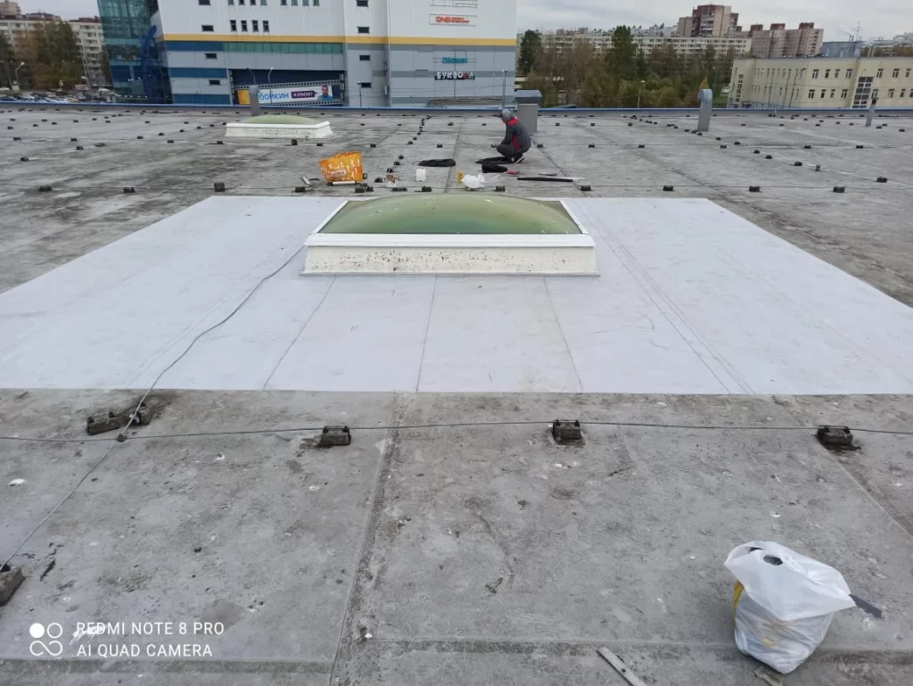 “Работали весной. Приходилось топить оставшуюся ледовую корку на поверхности мембраны. Нашли несколько повреждений в зоне работ. Устранили их и смонтировали огнезащиту“